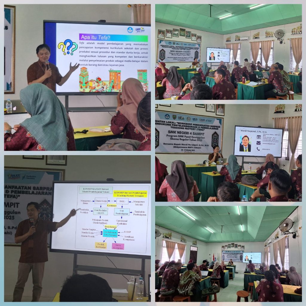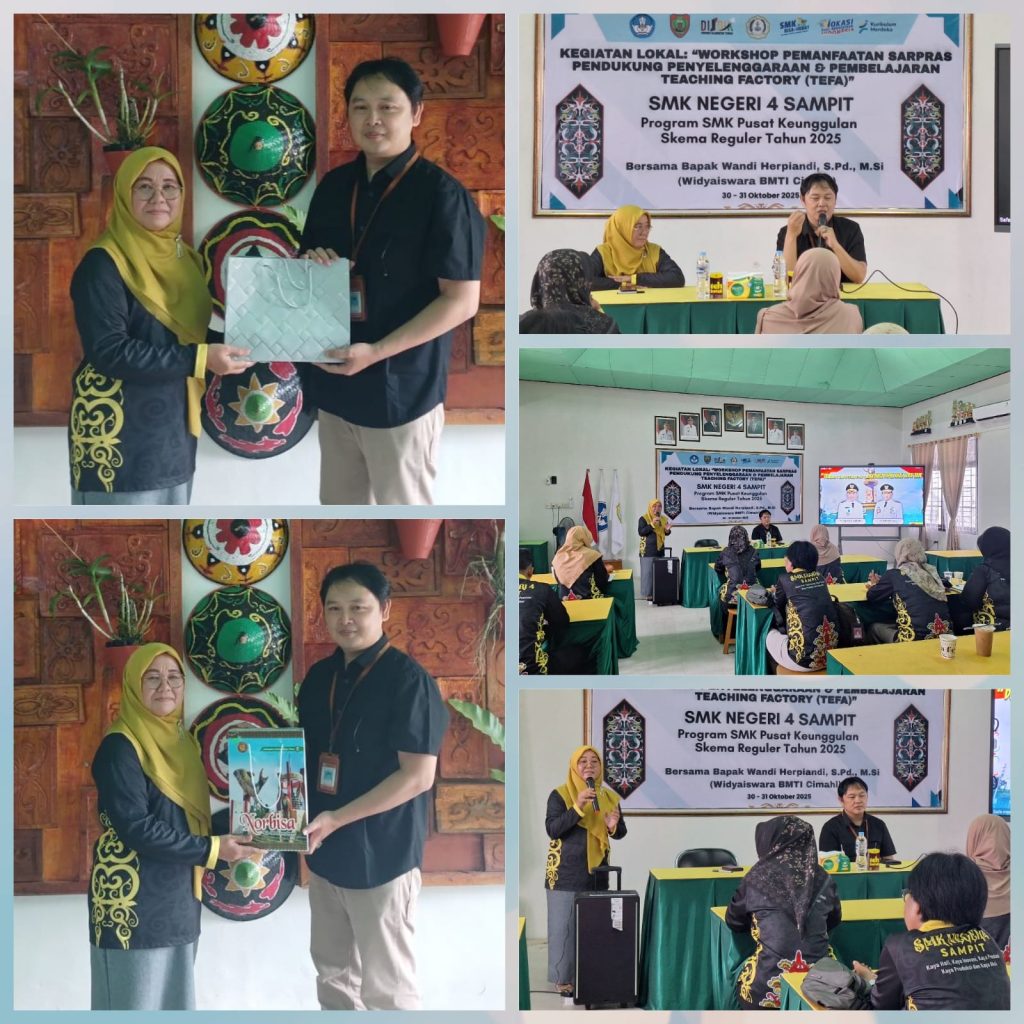 Dalam rangka mendukung peningkatan mutu pembelajaran vokasi dan pelaksanaan Program SMK Pusat Keunggulan (PK) Skema Reguler Tahun 2025, SMK Negeri 4 Sampit menyelenggarakan kegiatan Workshop Pemanfaatan Sarpras Pendukung Penyelenggaraan dan Pembelajaran Teaching Factory (TEFA) pada tanggal 30–31 Oktober 2025.
